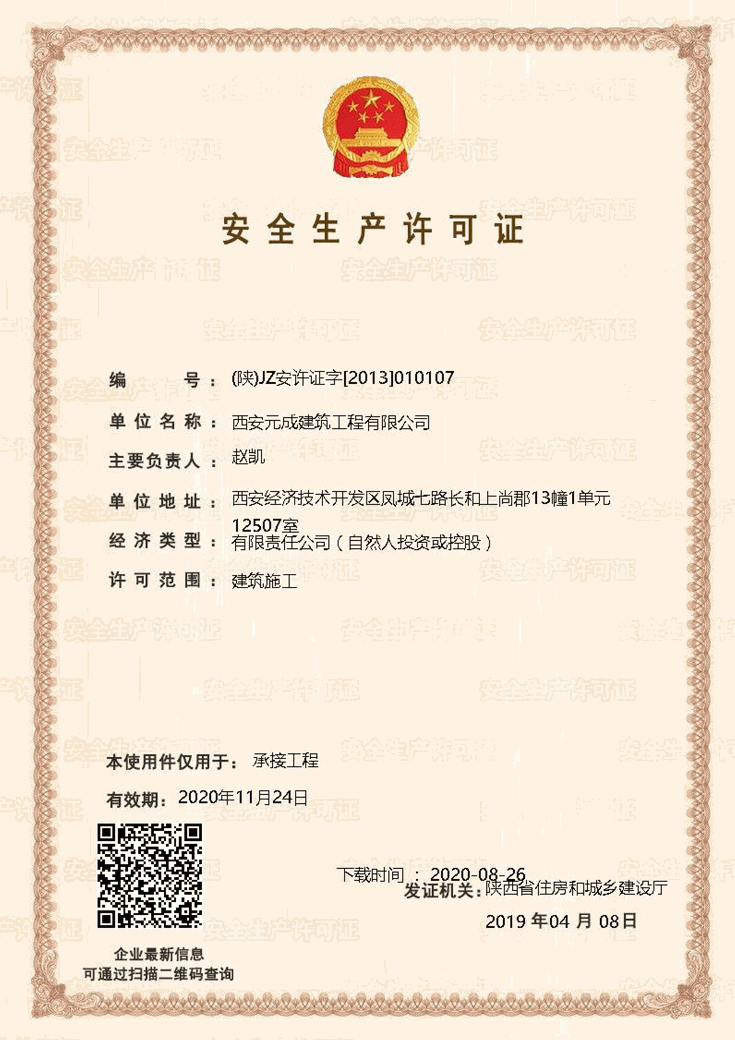 西安元成建筑工程有限公司成立于2012年,是一家擁有建筑工程、市政公用工程、石油化工工程、機(jī)電工程施工總承包貳級(jí);鋼結(jié)構(gòu)工程、防水防腐保溫工程專業(yè)承包貳級(jí);電力工程、水利水電工程施工總承包叁級(jí);建筑機(jī)電安裝工程、輸變電工程、環(huán)保工程專業(yè)承包三級(jí);模板腳手架專業(yè)承包、勞務(wù)分包等綜合性施工企業(yè)。